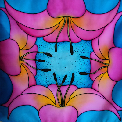 Затем разрабатывают эскизы в цвете, увеличивают изображение в размер подрамника, переводят увеличенный эскиз на ткань, резервируют и приступают к работе акриловыми красителями по ткани.