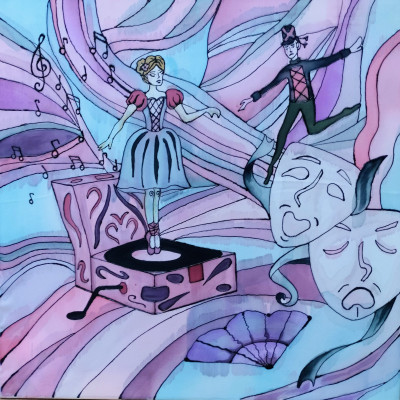 На выставке творческих работ представлены: роспись платка на свободную тему и панно "Музыка", "Театр".