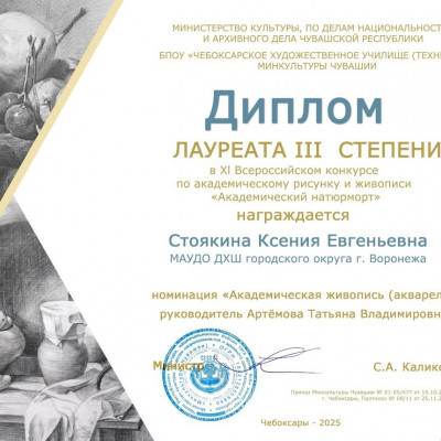 Обучающиеся Детской художественной школы г. Воронежа продемонстрировали высокий уровень мастерства, став лауреатами XI Всероссийского конкурса "Академический натюрморт" по академическому рисунку и живописи, который состоялся в г. Чебоксары.