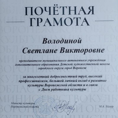 Почетной грамотой министерства культуры Воронежской области награждена преподаватель Детской художественной школы Володина Светлана Викторовна.
