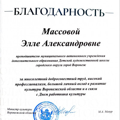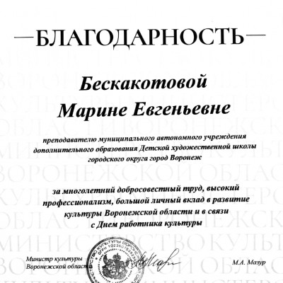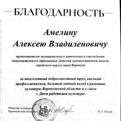 Благодарность от министерства культуры Воронежской области получили преподаватели: Бескакотова Марина Евгеньевна, Массова Элла Александровна, Амелин Алексей Владиленович, Еремин Алексей Вячеславович.