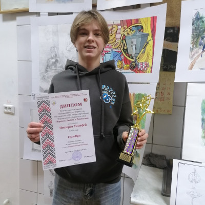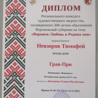 В региональном конкурсе художественного творчества, посвященном 300-летию образования Воронежской губернии на тему "Воронеж-любовь и Родина моя" в номинации "Живопись" ГРАН-ПРИ получил Невзоров Тимофей (преподаватель Дмитриева Г.М.).