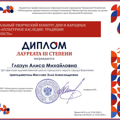 Глазун Алиса - Лауреат III степени (преподаватель Массова Э.А.);