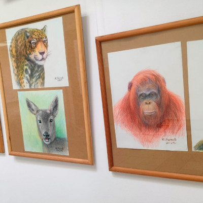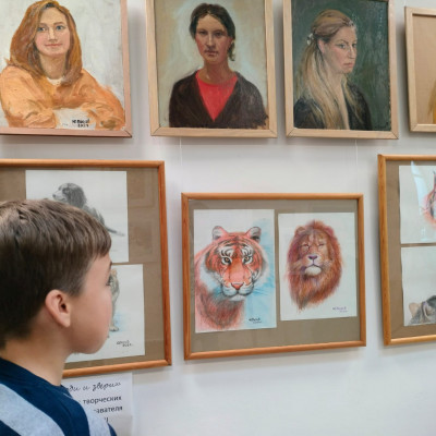 В экспозицию вошли живописные портреты, а также наброски животных, выполненные графическими материалами. Удивительные графические зарисовки различных животных выполнены по памяти и наблюдениям художника. Эти замечательные наброски наполнены добрыми эмоциями и зарядом энергии, привлекают внимание наших юных художников.